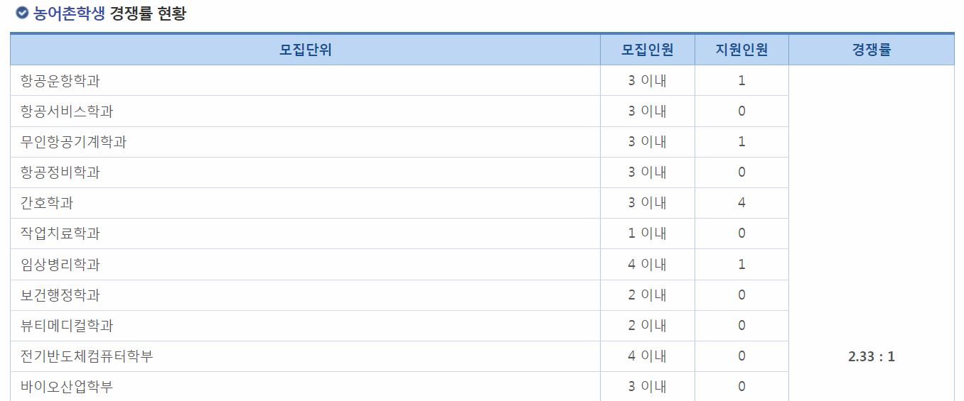 농어촌학생의 경우 학과를 통합하여 모집했으며, 경쟁률은 2.33:1 이었습니다.