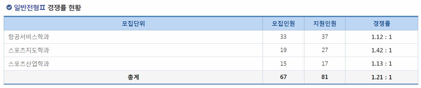 일반전형2에서는 항공서비스학과, 스포츠지도학과, 스포츠산업학과의 신입생을 모집했으며, 항공서비스학과의 경쟁률은 1.12:1, 스포츠지도학과의 경쟁률은 1.42:1, 스포츠산업학과의 경쟁률은 1.13:1 이었습니다.