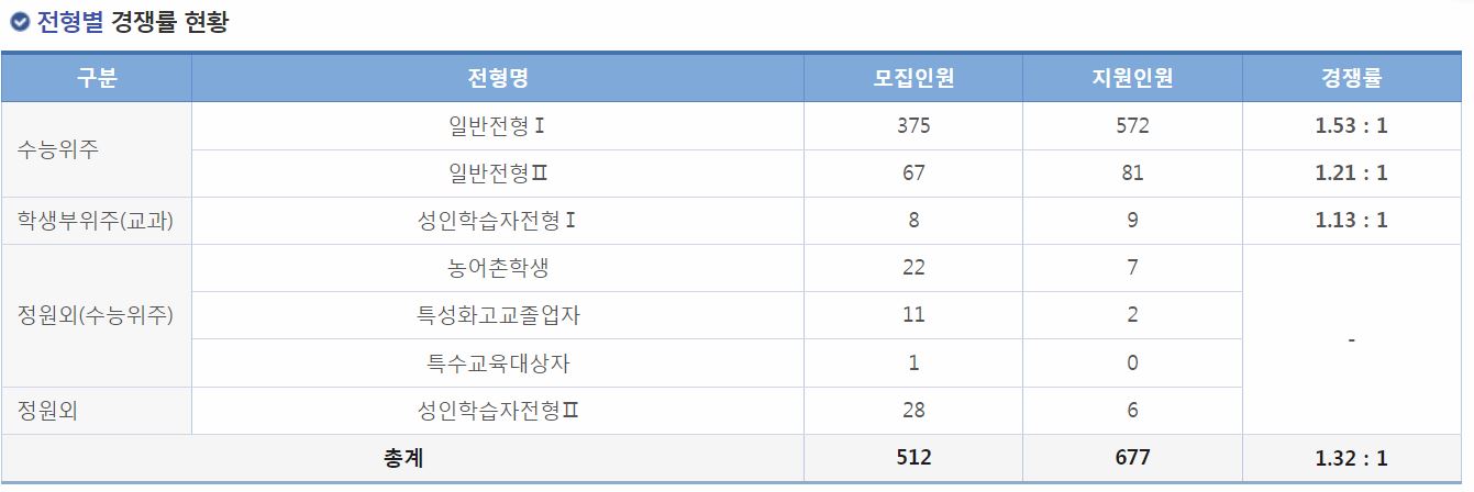 전형별 경쟁률에 대해 살펴보자면, 일반전형1의 경쟁률은 1.53:1, 일반전형2의 경쟁률은 1.21:1, 성인학습자전형1의 경쟁률은 1.13:1 이었습니다.