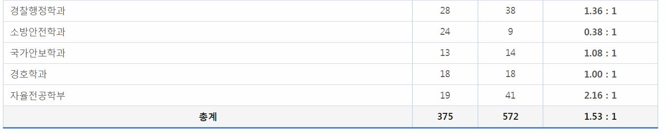 일반전형1의 소방안전학과는 미달이었으며, 뷰티메디컬학과, 경호학과의 모집인원과 지원인원은 같았습니다. 이외의 학과 중 가장 경쟁률이 높았던 학과는 간호학과(4.53:1), 보건행정학과(2.21:1), 자율전공학부(2.16:1) 순이었습니다.