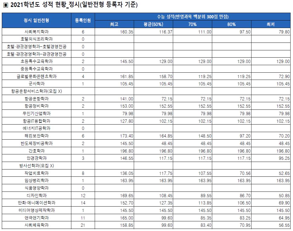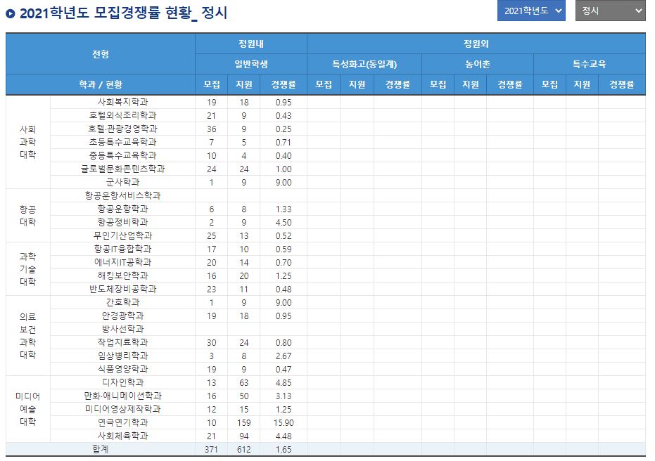 2021학년도에는 사회복지학과, 호텔외식조리학과, 호텔관광경영학과, 초등특수교육학과, 중등특수교육학과, 무인기산업학과, 항공IT융합학과, 에너지IT공학과, 반도체장비공학과, 안경광학과, 작업치료학과, 식품영양학과가 미달이었으며, 나머지 학과 중 가장 경쟁률이 높았던 학과는 연극연기학과(15.90:1) 이었습니다.