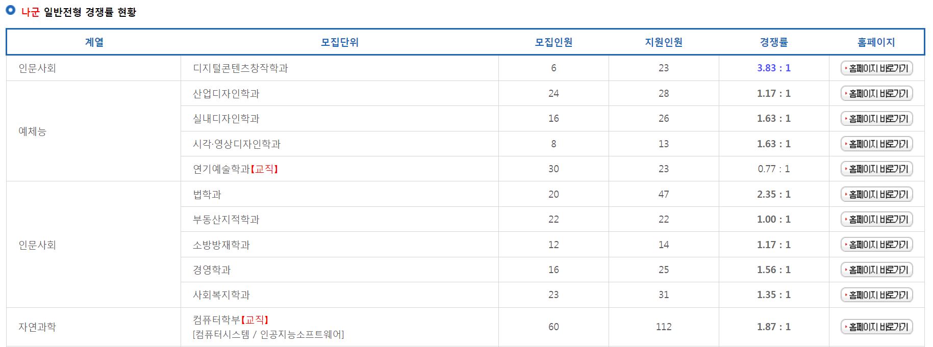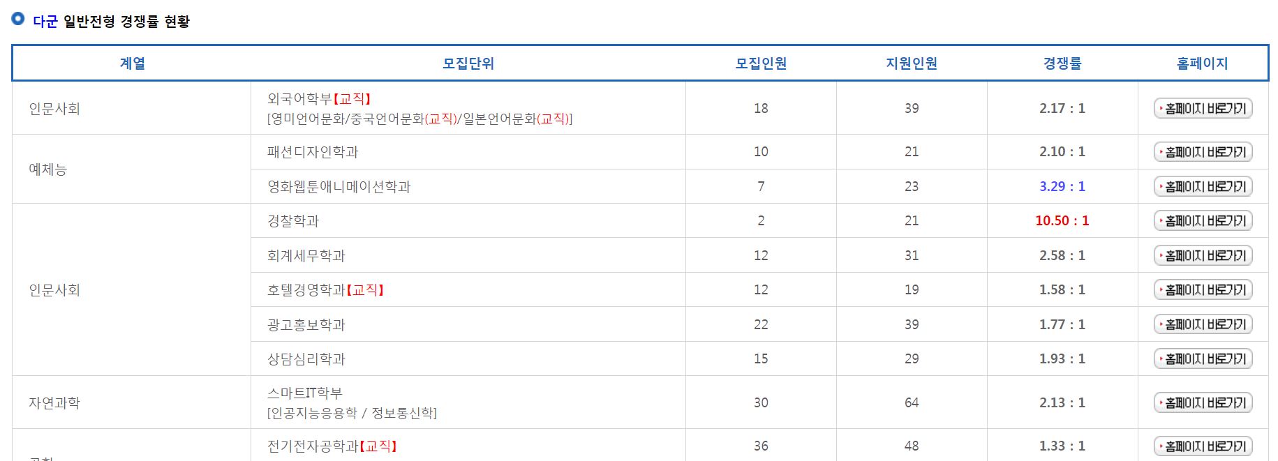 다군 일반전형의 재난안전학과, 뷰티케어학과는 미달이었으며, 이외의 학과 중 가장 경쟁률이 높았던 학과는 경찰학과(10.50:1), 간호학과(9.36:1), 영화웹툰애니메이션학과(3.29:1) 순이었습니다.
