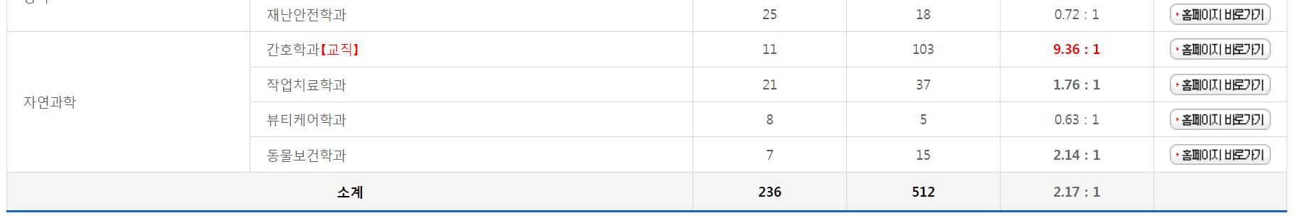 나군 일반전형의 연기예술학과, 바이오코스메틱학과는 미달이었으며, 이외의 학과 중 가장 경쟁률이 높았던 학과는 임상병리학과(6.80:1), 한의예과(6.00:1), 디지털콘텐츠창작학과(3.83:1) 순이었습니다.