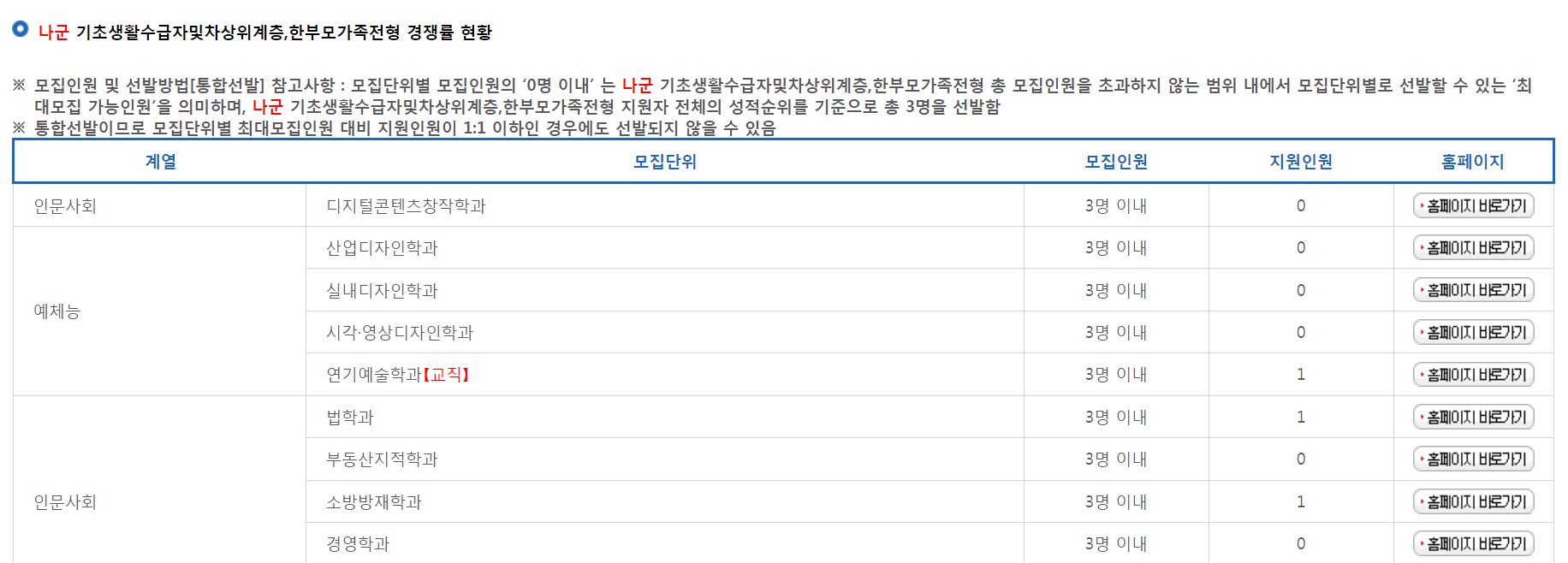 다군 기초생활수급자및차상위계층,한부모가족전형 경쟁률 현황
