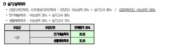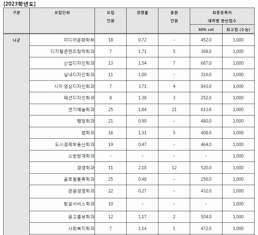 나군 : 미디어문화학부, 디지털콘텐츠창작학과, 산업디자인학과, 실내디자인학과, 시각영상디자인학과, 패션디자인학과, 연기예술학과, 영화웹툰애니메이션학과, 행정학과, 법학과, 도시경제부동산학과, 소방방재학과, 회계세무학과, 무역경영학과, 항공서비스학과, 사회복지학과, 컴퓨터학부, 전자공학과, 건축학과, 보건안전공학과, 바이오환경공학과, 임상병리학과, 바이오제약산업학부, 화장품뷰티학부, 바이오식품영양학부, 생활체육학과, 한의예과