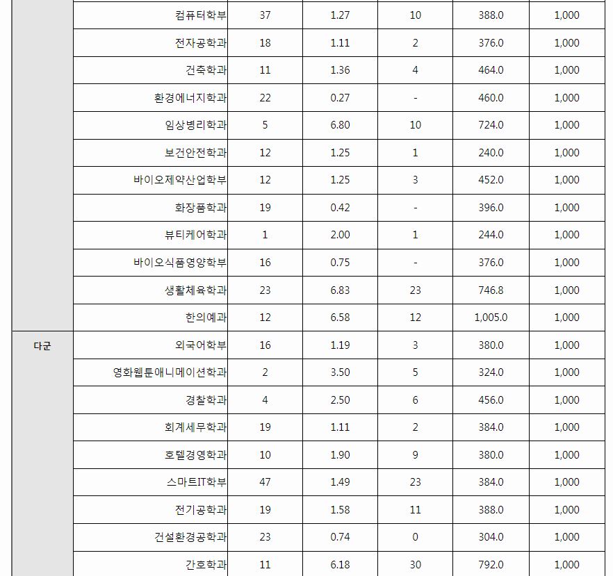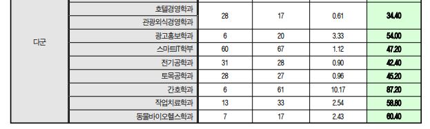다군 : 외국어학부, 영화웹툰애니메이션학과, 경찰학과, 회계세무학과, 호텔경영학과, 스마트IT학부, 전기공학과, 건설환경공학과, 간호학과, 작업치료학과, 동물바이오헬스학과