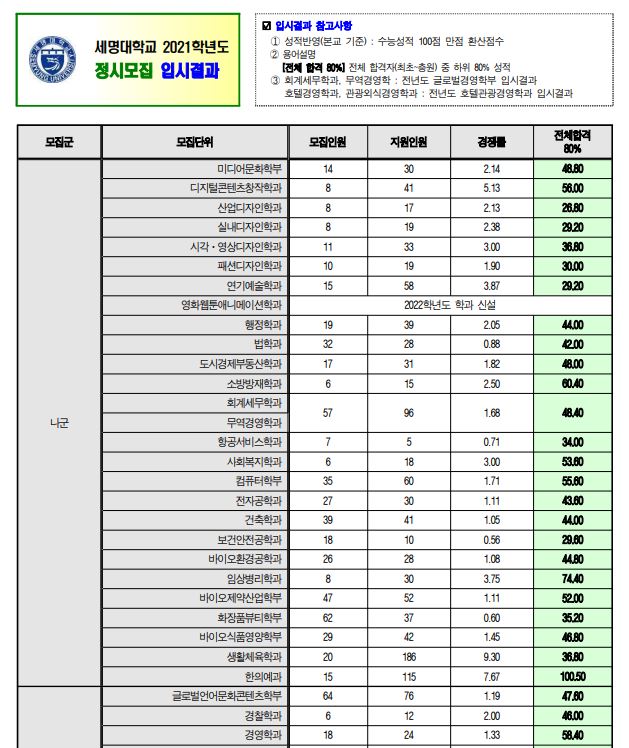 작년 세명대학교의 미디어문화학부, 행정학과, 도시경제부동산학과, 글로벌물류학과, 관광경영학과, 환경에너지학과, 화장품학과, 바이오식품영양학부, 건설환경공학과는 미달이었으며, 이외의 학과 중 가장 경쟁률이 높았던 학과는 생활체육학과(6.83:1), 임상병리학과(6.80:1), 한의예과(6.58:1) 순이었습니다.