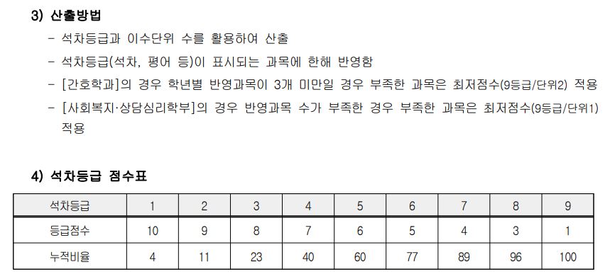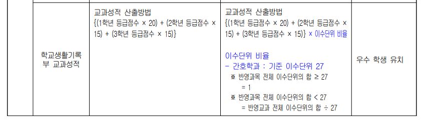 또한, 교과성적ㄱ 산출방법에서 이수단위 비율을 곱하게 되었는데, 간호학과의 경우 기준 이수단위 27을 곱합니다.