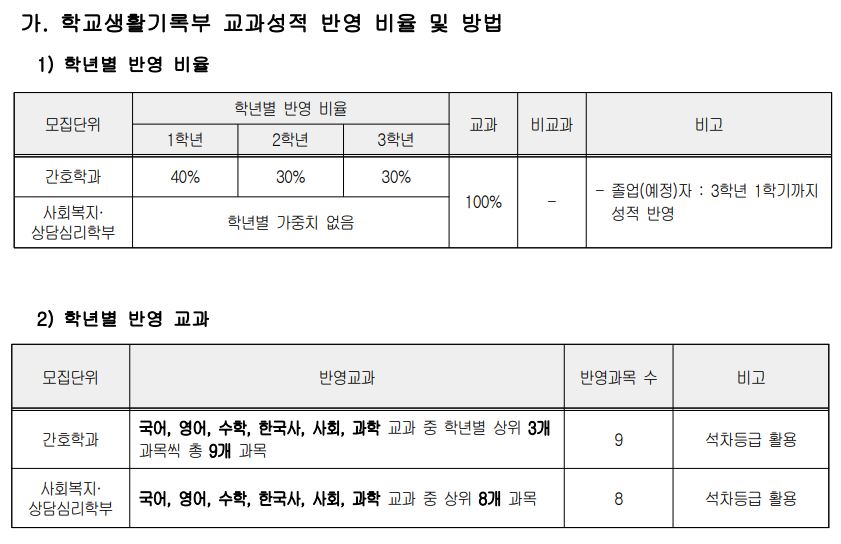 학교생활기록부 교과성적 반영 비율을 보자면, 간호학과는 1학년 40%, 2학년 30%, 3학년 30%를 반영하며 사회복지상담심리학부는 학년별 가중치가 없습니다. 또한, 졸업자와 졸업예정자 구분 없이 모두 3학년 1학기까지의 성적만을 반영합니다.