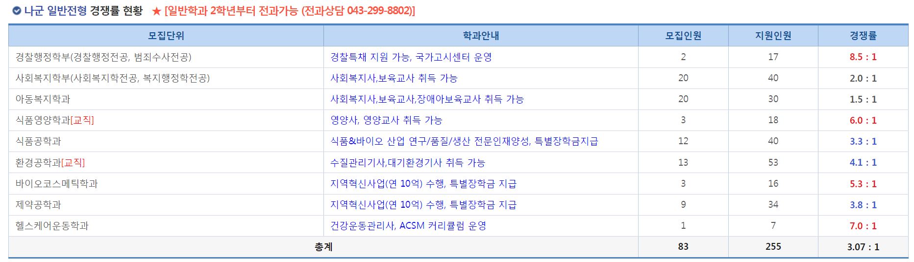 나군 일반전형에서 가장 경쟁률이 높았던 학과는 경찰행정학부(경찰행정전공, 범죄수사전공)(8.5:1), 헬스케어운동학과(7.0:1), 식품영양학과(6.0:1) 순이었습니다.