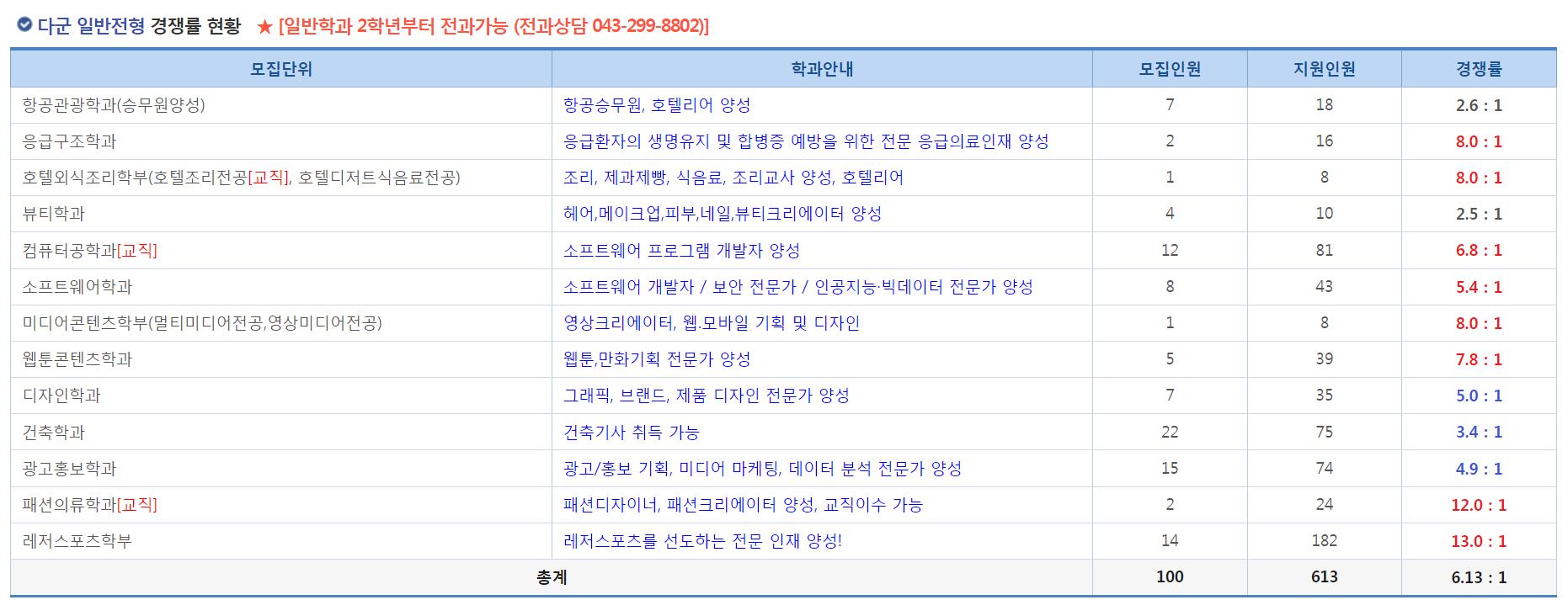 다군 일반전형에서 가장 경쟁률이 높았던 학과는 레저스포츠학부(13.0:1), 패션의류학과(12.0:1), 응급구조학과(8.0:1), 호텔외식조리학부(호텔조리전공, 호텔디저트식음료전공)(8.0:1), 미디어콘텐츠학부(멀티미디어전공, 영상미디어전공)(8.0:1) 순이었습니다.
