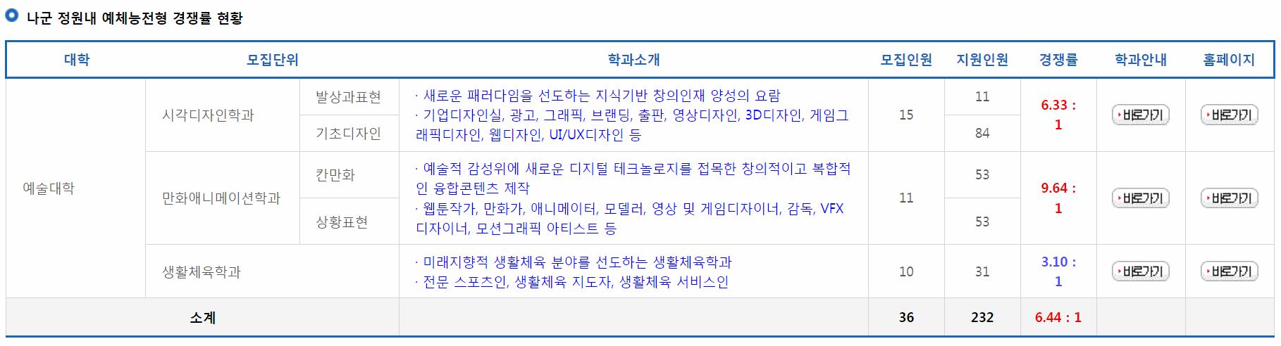 나군 정원내 예체능전형에서는 시각디자인학과, 만화애니메이션학과, 생활체육학과의 신입생을 모집했으며, 시각디자인학과의 경쟁률은 6.33:1, 만화애니메이션학과의 경쟁률은 9.64:1, 생활체육학과의 경쟁률은 3.10:1 이었습니다.