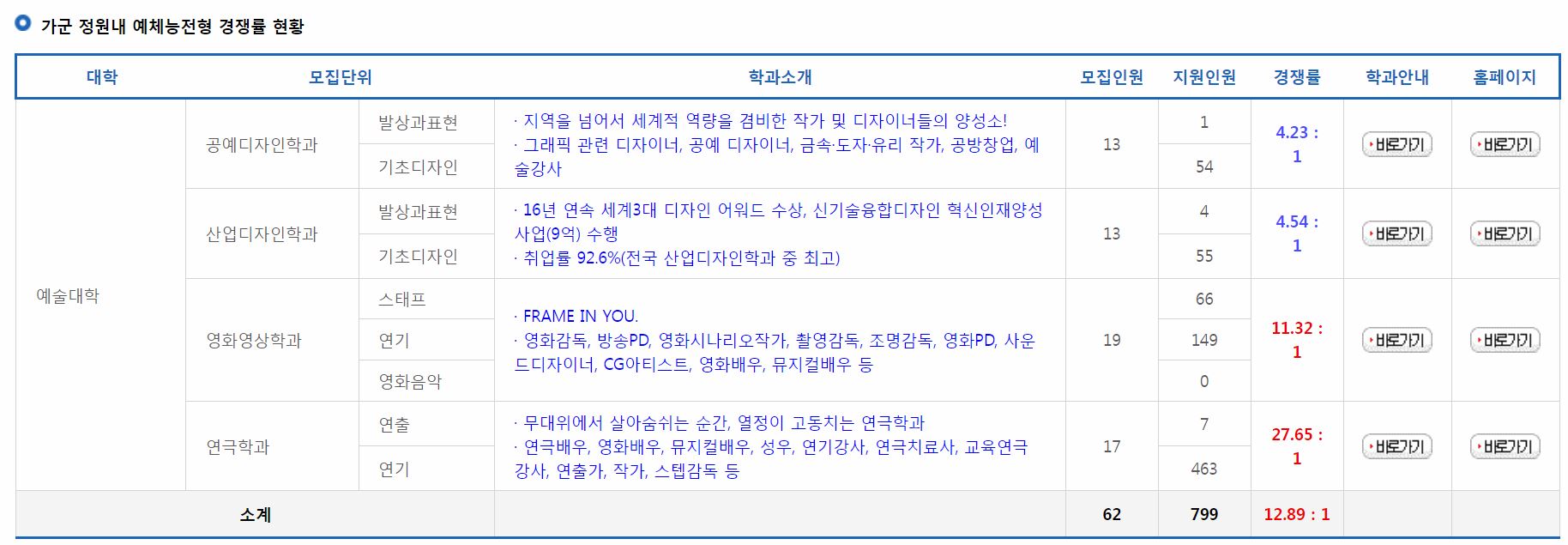 가군 정원내예체능전형에서 가장 경쟁률이 높았던 학과는 연극학과(27.65:1), 영화영상학과(11.32:1), 산업디자인학과(4.54:1) 순이었습니다.
