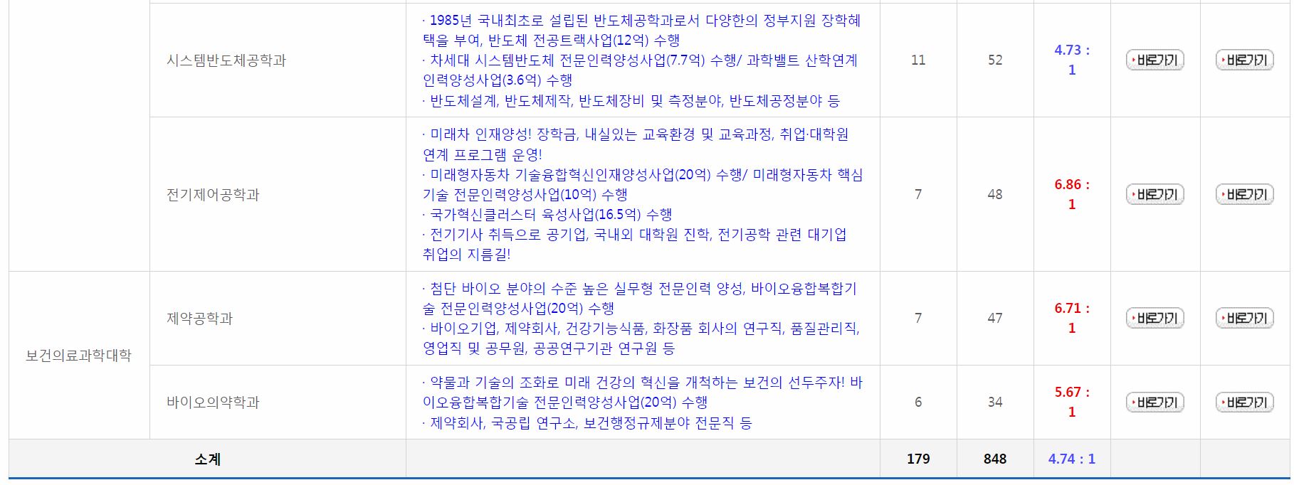 가군 정원내 일반전형에서 가장 경쟁률이 높았던 학과는 전기제어공학과(6.86:1), 제약공학과(6.71:1), 데이터사이언스학과(5.89:1) 순이었습니다.
