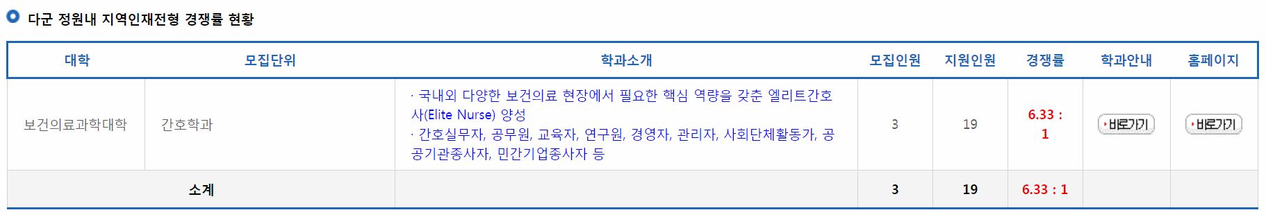 다군 정원내 지역인재전형에서는 간호학과의 신입생을 모집했으며, 경쟁률은 6.33:1 이었습니다.
