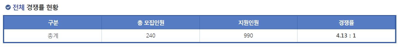 전체 경쟁률을 먼저 살펴보도록 하겠습니다. 모든 전형을 통틀어 올해 한국교원대학교의 정시 경쟁률은 4.13:1 이었습니다.