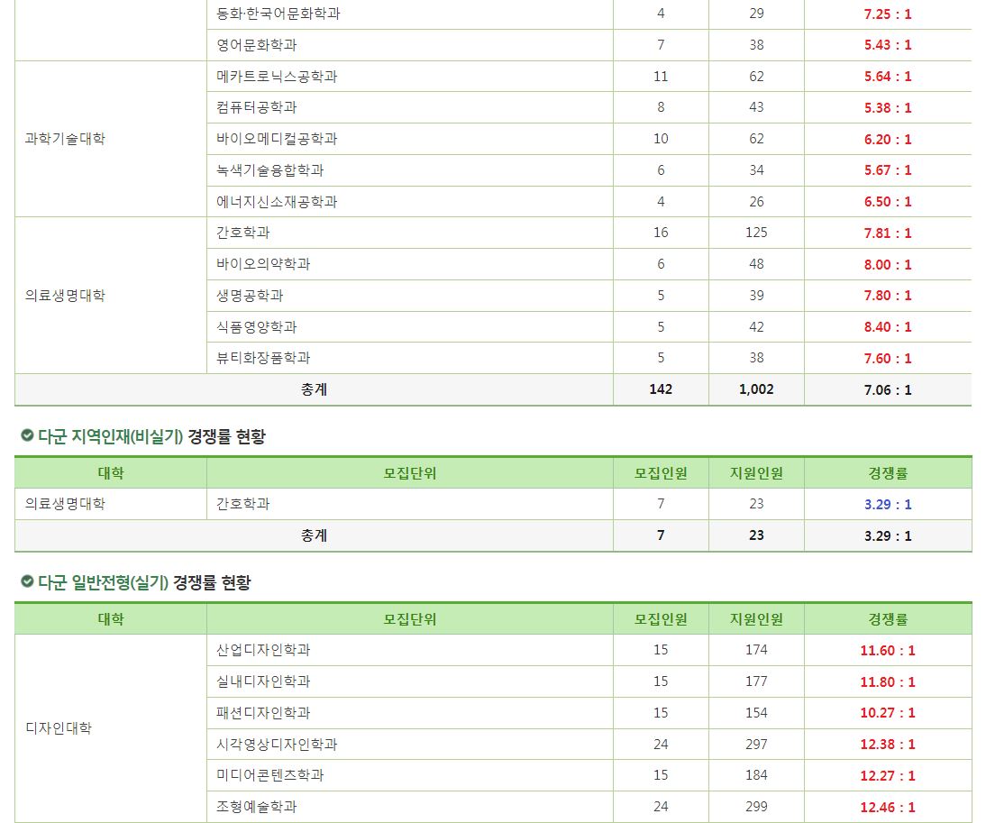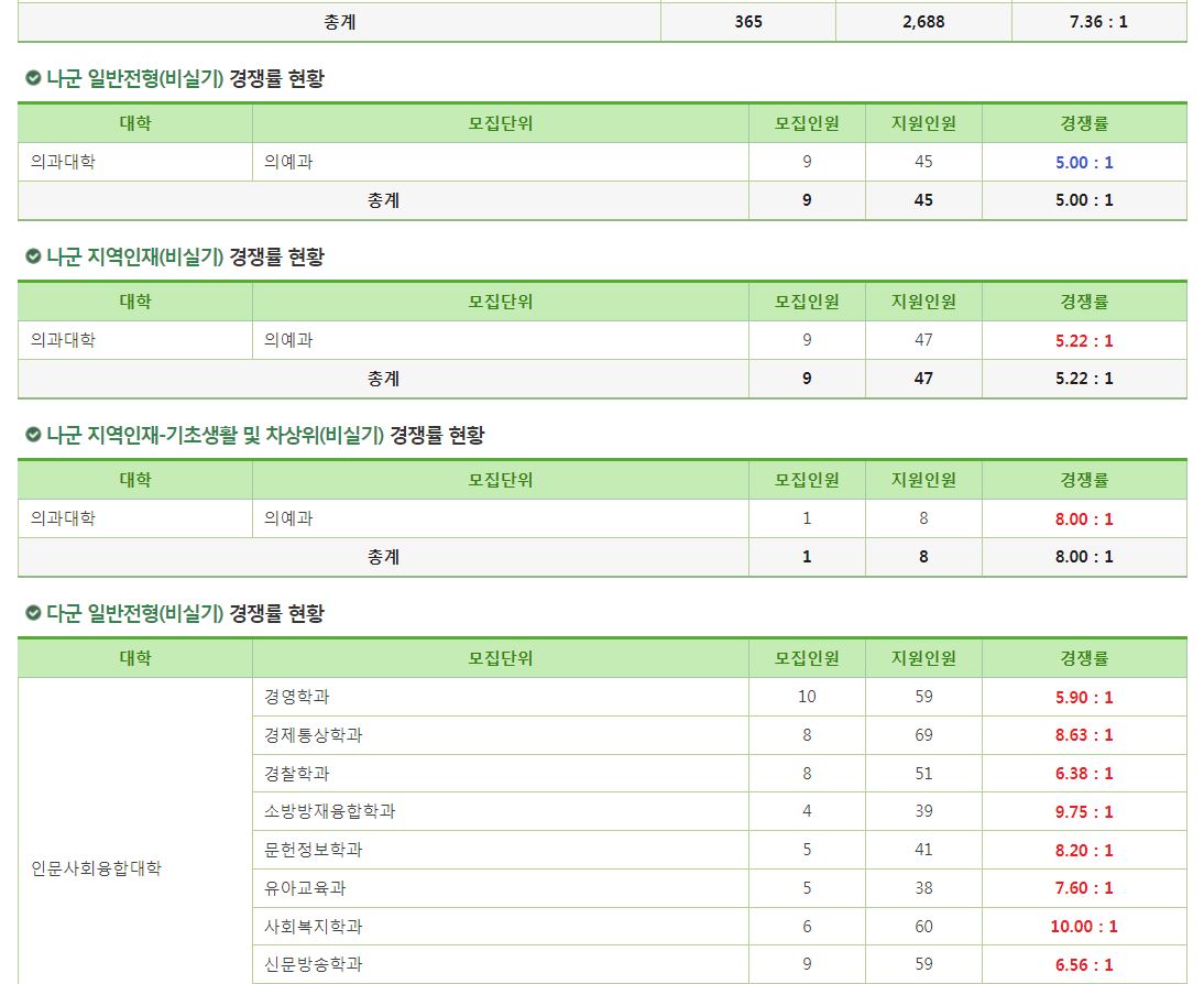 나군 일반전형(비실기), 나군 지역인재(비실기), 나군 지역인재-기초생활 및 차상위(비실기) 전형으로는 의예과만 모집을 했는데요, 경쟁률은 각각 5.00:1, 5.22:1, 8.00:1 이었습니다.