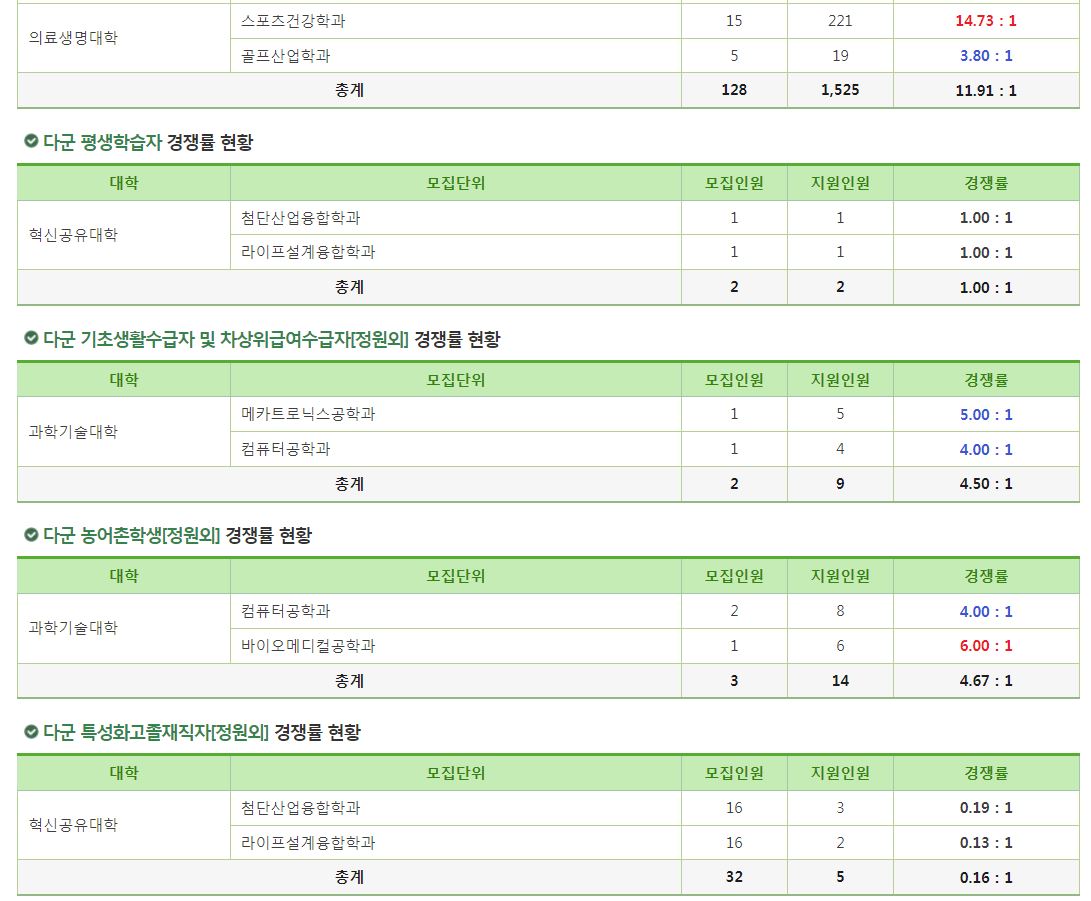 다군 평생학습자 전형으로는 첨단산업융합학과, 라이프설계융합학과를 모집했으며, 모집인원과 지원인원이 같았습니다.