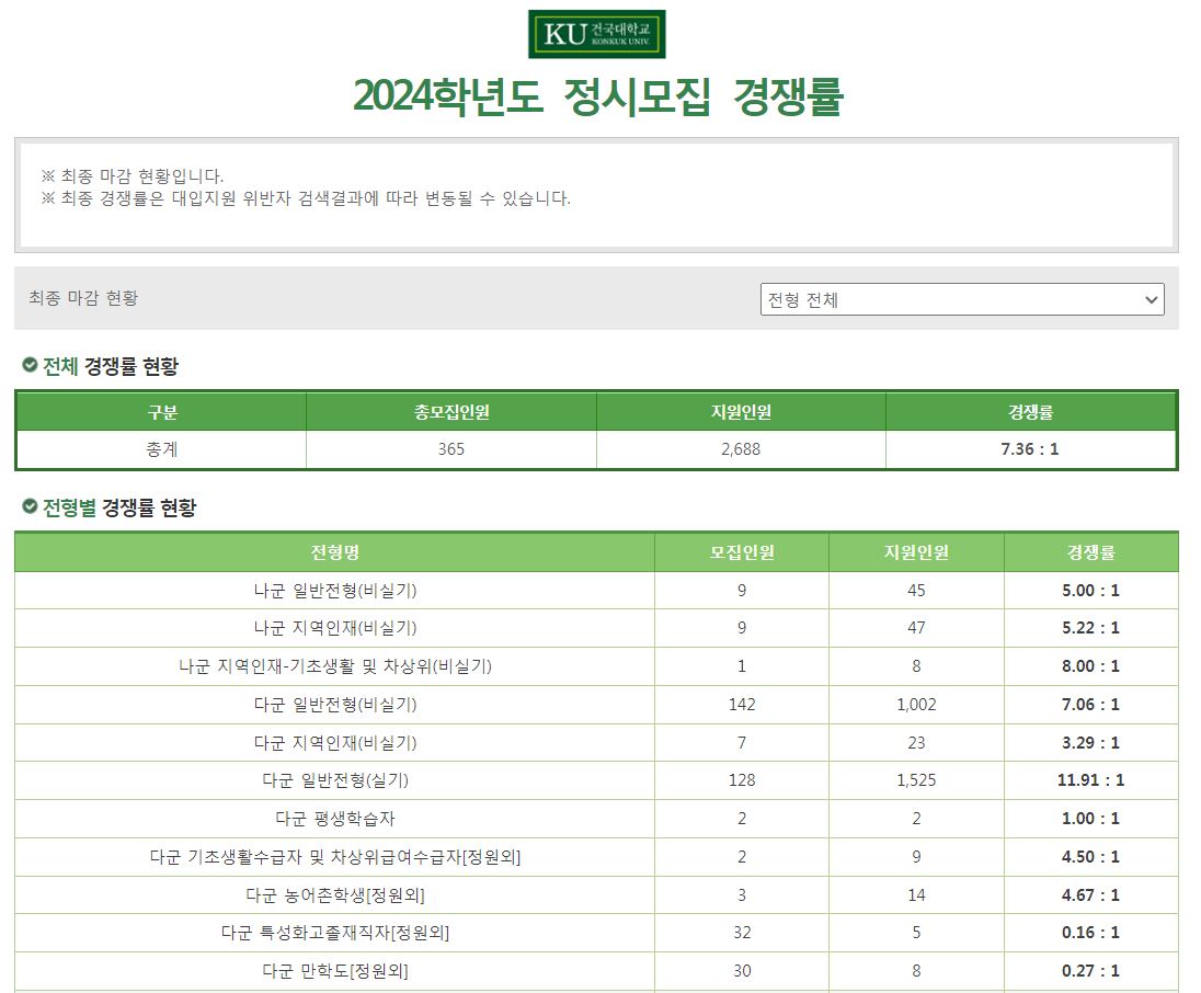 | [4년제/서울특별시] 2024학년도 건국대학교 정시 최종 경쟁률 (1) | 2024.01.12 |