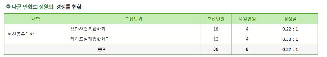 다군 만학도[정원외] 전형으로도 첨단산업융합학과, 라이프설계융합학과를 모집했으나 모두 미달이었습니다.